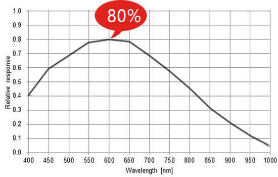 在550-600nm處,量子效率高達(dá)80%,這是普通前照式sCMOS相機(jī)所不能比擬的,此外還擁有400nm的光譜響應(yīng)范圍,在可見光、紫外波段與近紅外均有優(yōu)異的光譜響應(yīng)。