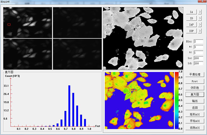 熒光共振能量轉(zhuǎn)移(FRET)技術(shù)被廣泛應(yīng)用于活細(xì)胞中生物大分子構(gòu)象變化和分子間動(dòng)態(tài)相互作用的實(shí)時(shí)研究。本軟件采用受體光漂白方法進(jìn)行FRET定量計(jì)算,同時(shí)生成FRET效率分布偽彩圖和數(shù)據(jù)統(tǒng)計(jì)直方圖進(jìn)行數(shù)據(jù)分析。