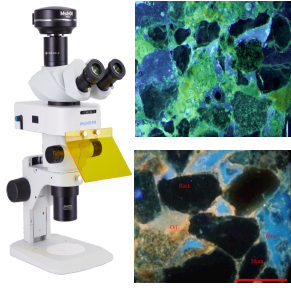 石油具有熒光性,在熒光顯微鏡激發(fā)下會發(fā)出熒光,巖樣含油量即便只有萬分之一,熒光顯微鏡也能檢出,而且不同的熒光顏色和強弱還能分辨出油質(zhì)輕重。輕質(zhì)石油呈藍色熒光,重質(zhì)石油呈黃色熒光,瀝青呈暗黃到褐色。