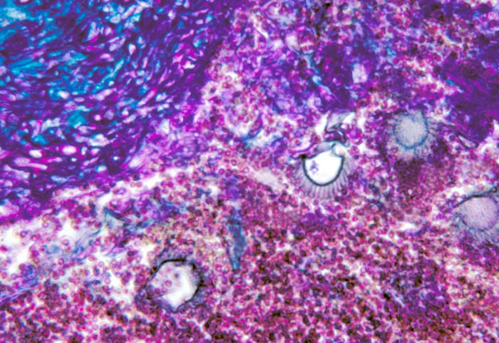 此外,在肺曲菌病的病理切片中,還可以觀察到與菌絲侵入血管腔相關的壞死灶和出血灶。當曲霉菌感染涉及大動脈時,可能會出現楔形梗塞。這些梗塞可能進一步導致進行性空洞的形成,進而可能發(fā)展為真菌球。這些病理變化是肺曲菌病在顯微鏡下的典型表現。