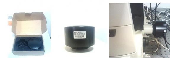 這次的相機采用簡易紙盒包裝(如圖),沒有多少防震措施。體積比上次試用的相機要大,重量也更重,外形和我的自用相機很像,很有親切感。黑色圓柱形機身上貼有名牌、型號、串號、“制冷”、“數(shù)據(jù)”等貼紙。相機與顯微鏡C口匹配(如圖),安裝過程輕松完成。相機通過USB直接連接電腦,方便快捷。而且即使在使用過程中連接線不小心被碰掉,也沒有造成故障,重新插上即可。需要占用三個USB口:一個用于數(shù)據(jù)傳輸,一個用于制冷,還有一個用來插軟件狗。拍攝軟件的安裝一次成功,但在安裝驅(qū)動時,發(fā)現(xiàn)光盤內(nèi)實際的文件名與說明書上的不符。從硬件參數(shù)上來看,該相機的芯片像素尺寸3.4微米,共500萬像素,冷卻至室溫下10度,是一個主要用于高分辨明視野的配置。根據(jù)我的專業(yè)方向,本評測主要從細胞研究的角度來進行。