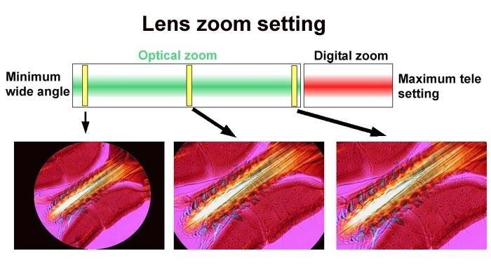 所有的卡片機,顯微圖像必須在相機設置為高變焦的情況下拍攝,換言之在遠程設置,在數(shù)碼變焦模式極端例子中。高變焦設置,圖像面也會變得更小。通常圖片的表面積是目鏡視場的25%-40%。