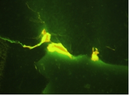 體視熒光顯微鏡下觀察瀝青呈暗黃到褐色