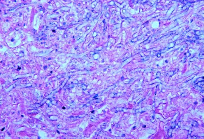 此外,在肺曲菌病的病理切片中,還可以觀察到與菌絲侵入血管腔相關的壞死灶和出血灶。當曲霉菌感染涉及大動脈時,可能會出現楔形梗塞。這些梗塞可能進一步導致進行性空洞的形成,進而可能發(fā)展為真菌球。這些病理變化是肺曲菌病在顯微鏡下的典型表現。