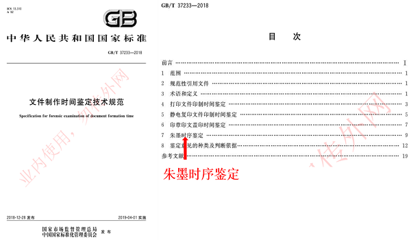 在國家標(biāo)準(zhǔn)的《文件制作時(shí)間鑒定技術(shù)規(guī)范(GB/T37233-2018)》中“7朱墨時(shí)序鑒定”中先后提出了“顯微檢驗(yàn)法”、“熒光檢驗(yàn)法”、“光譜檢驗(yàn)法”和“實(shí)驗(yàn)檢驗(yàn)法”四種方法;而司法部于2010年出臺了部頒標(biāo)準(zhǔn)《朱墨時(shí)序鑒定規(guī)范》中只提出了“顯微檢驗(yàn)法”和“實(shí)驗(yàn)驗(yàn)證”2種方法。